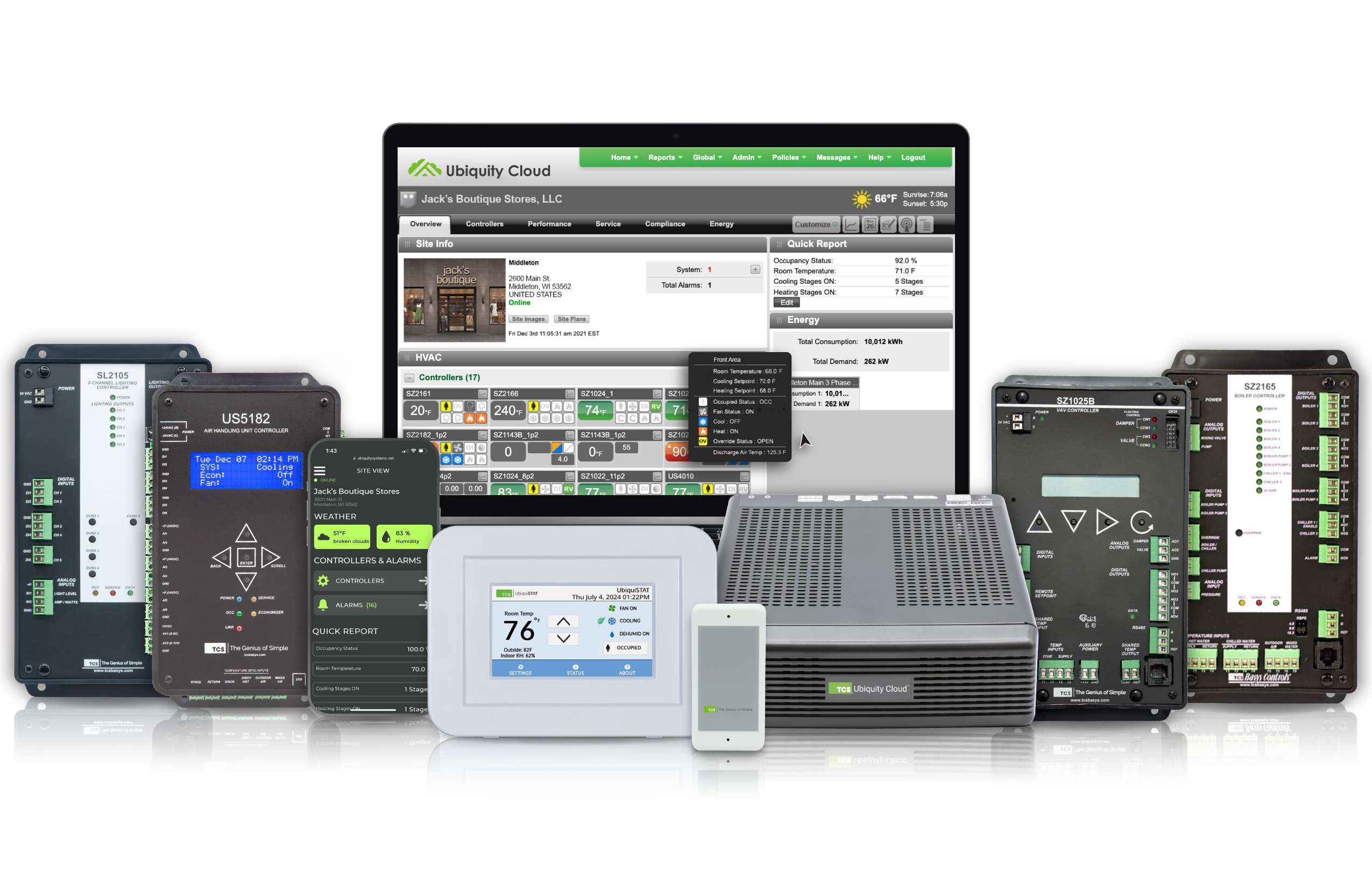 TCS has manufactured hardware for the building controls market for more than 40 years. Thousands of retail locations, schools, churches and multi-site organizations save energy and improve operations with Ubiquity Cloud and TCS controls, including application-specific BACnet controls, thermostats, and sensors.
